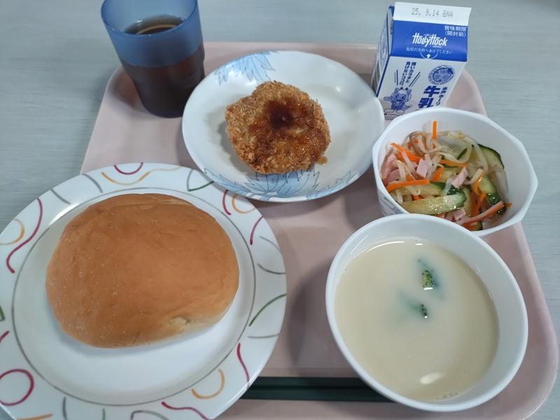 ・パン ・メンチカツ ・マリネサラダ ・豆乳スープ ・牛乳
