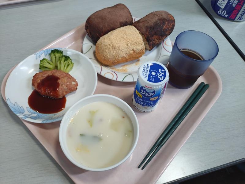 ・揚げパン(きなこ・ココア) ・豆腐ハンバーグ ・クリームスープ ・牛乳