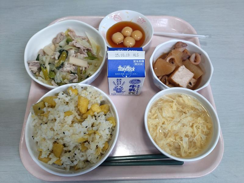 ・さつまいもご飯 ・豚肉の味噌漬け焼き ・イカと大根煮 ・すまし汁 ・お月見団子 ・牛乳