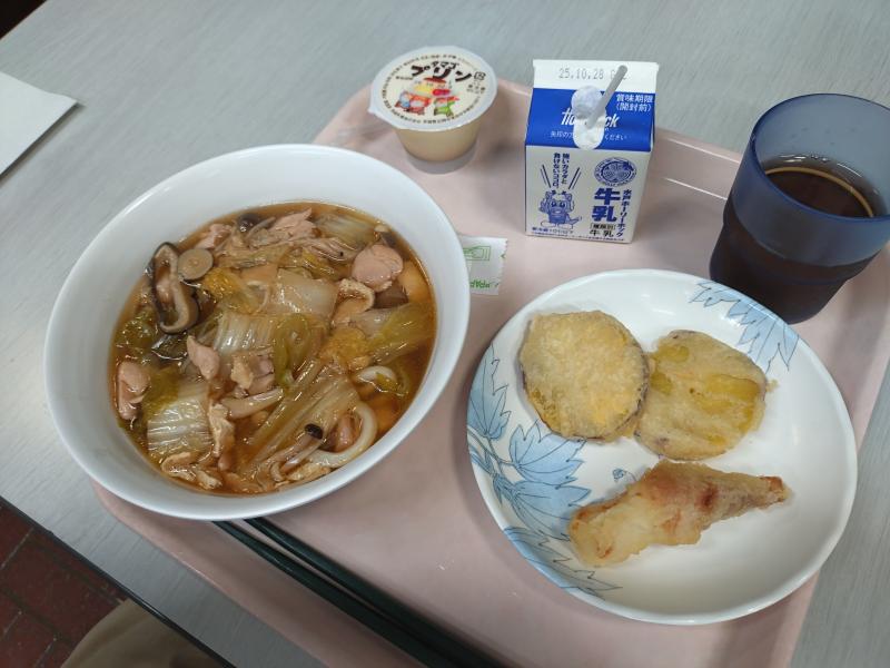・鶏ときのこのあんかけうどん ・天ぷら(さつまいも・ちくわ) ・プリン ・牛乳