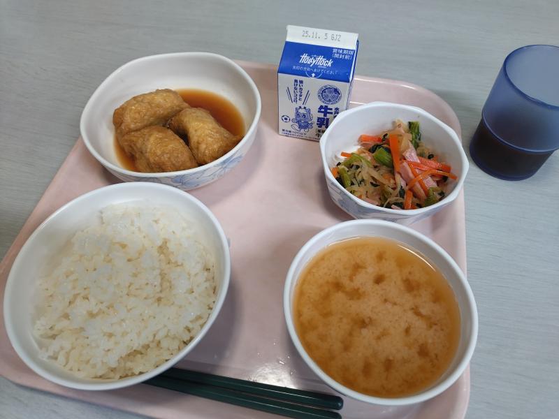 ・ご飯 ・油揚げの肉詰め ・小松菜の和え物 ・味噌汁 ・牛乳