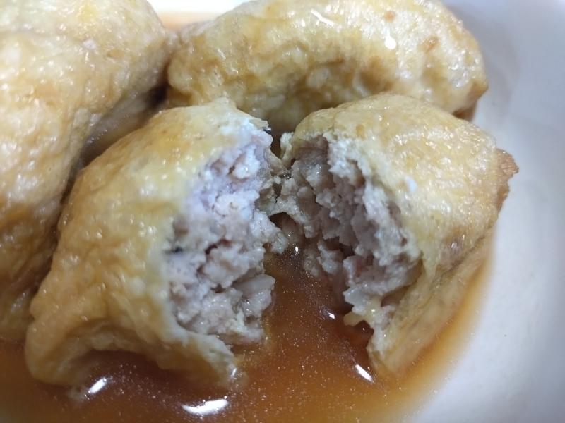 今日は油揚げの肉詰めです。ひき肉がたっぷり詰められていて美味しいです。リピート希望です。